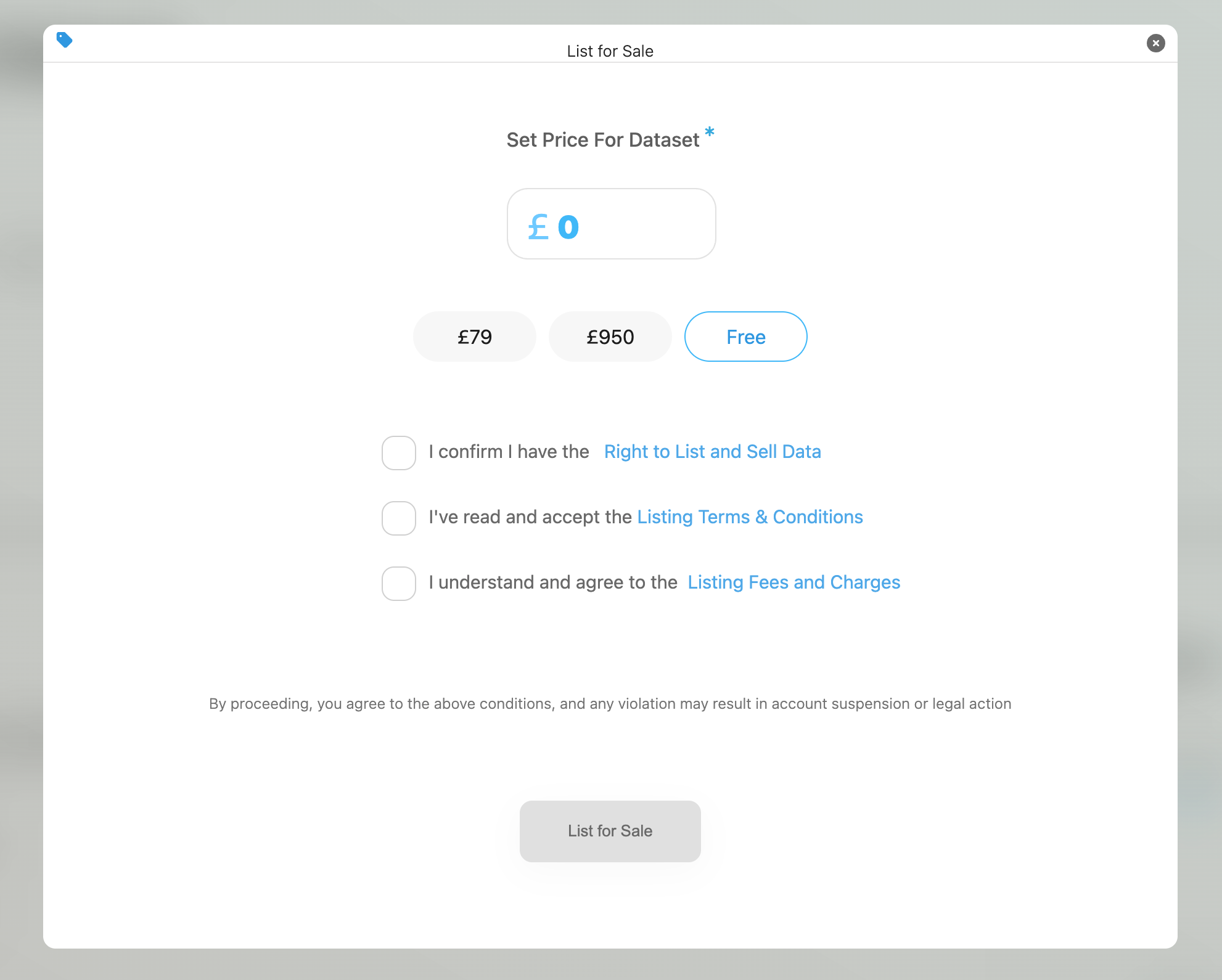 Confirm that you have the right to list and sell data\